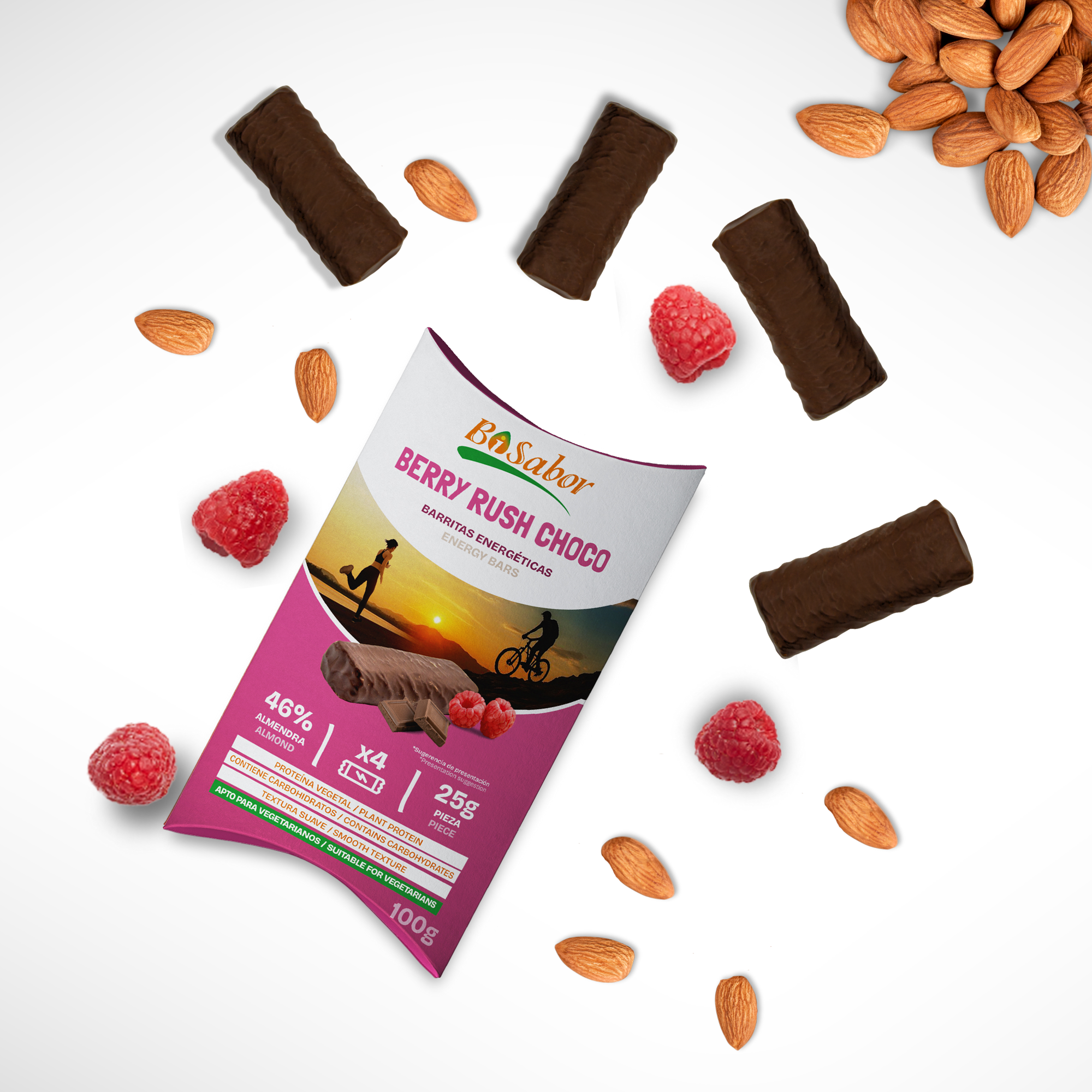 Estas barritas combinan una base de almendra nacional con un relleno de frambuesas y una cobertura de cacao, creando una mezcla de sabores dulces y naturales. Su textura blanda y formato práctico las hacen perfectas para llevar a cualquier lugar.