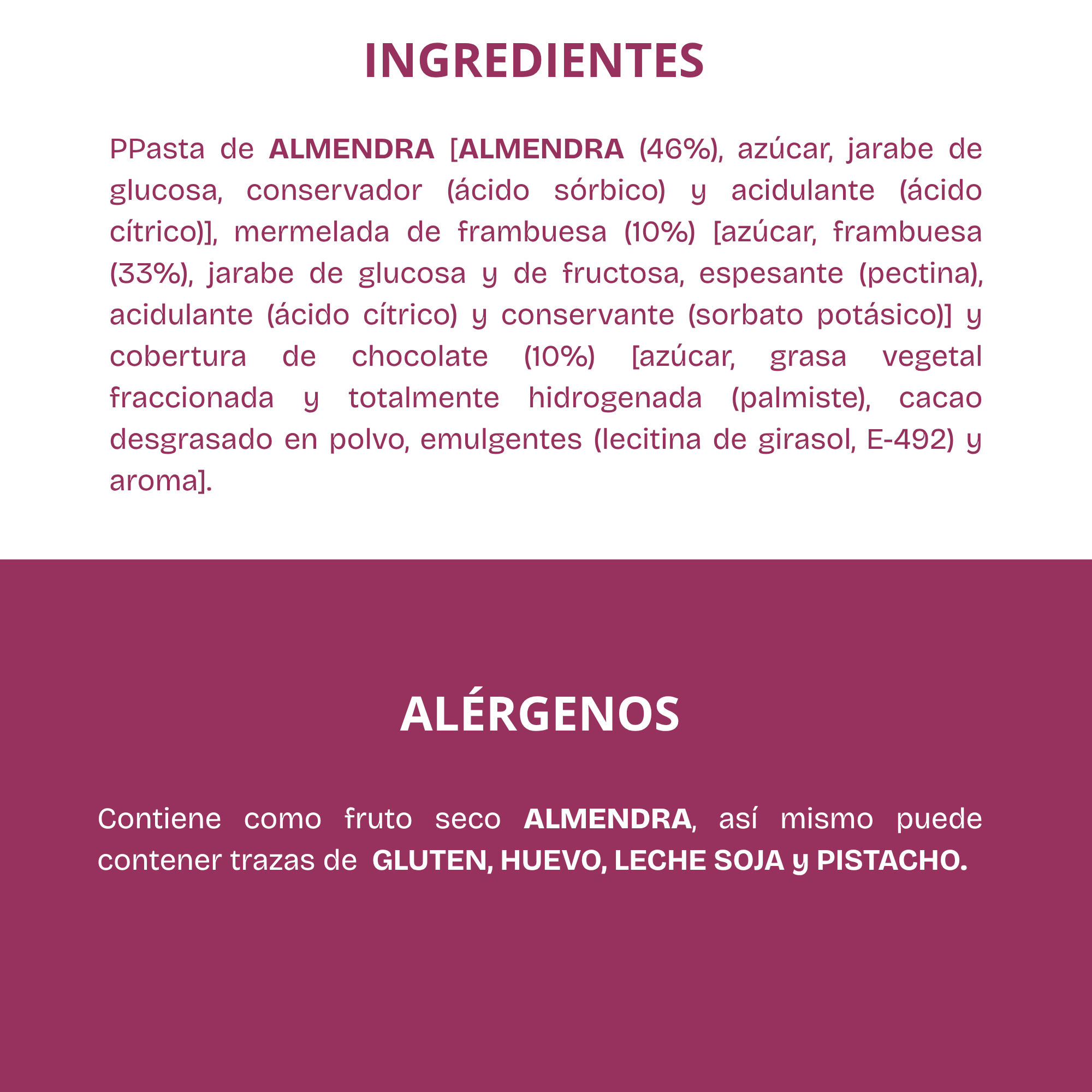 Pasta de almendra con relleno de frambuesa y cobertura de cacao. Ingredientes: Pasta de ALMENDRA [ALMENDRA (46%), azúcar, jarabe de glucosa, conservador (ácido sórbico) y acidulante (ácido cítrico)], mermelada de frambuesa (10%) [azúcar, frambuesa (33%), jarabe de glucosa y de fructosa, espesante (pectina), acidulante (ácido cítrico) y conservante (sorbato potásico)] y cobertura de chocolate (10%) [azúcar, grasa vegetal fraccionada y totalmente hidrogenada (palmiste), cacao desgrasado en polvo, emulgentes (lecitina de girasol, E-492) y aroma].
