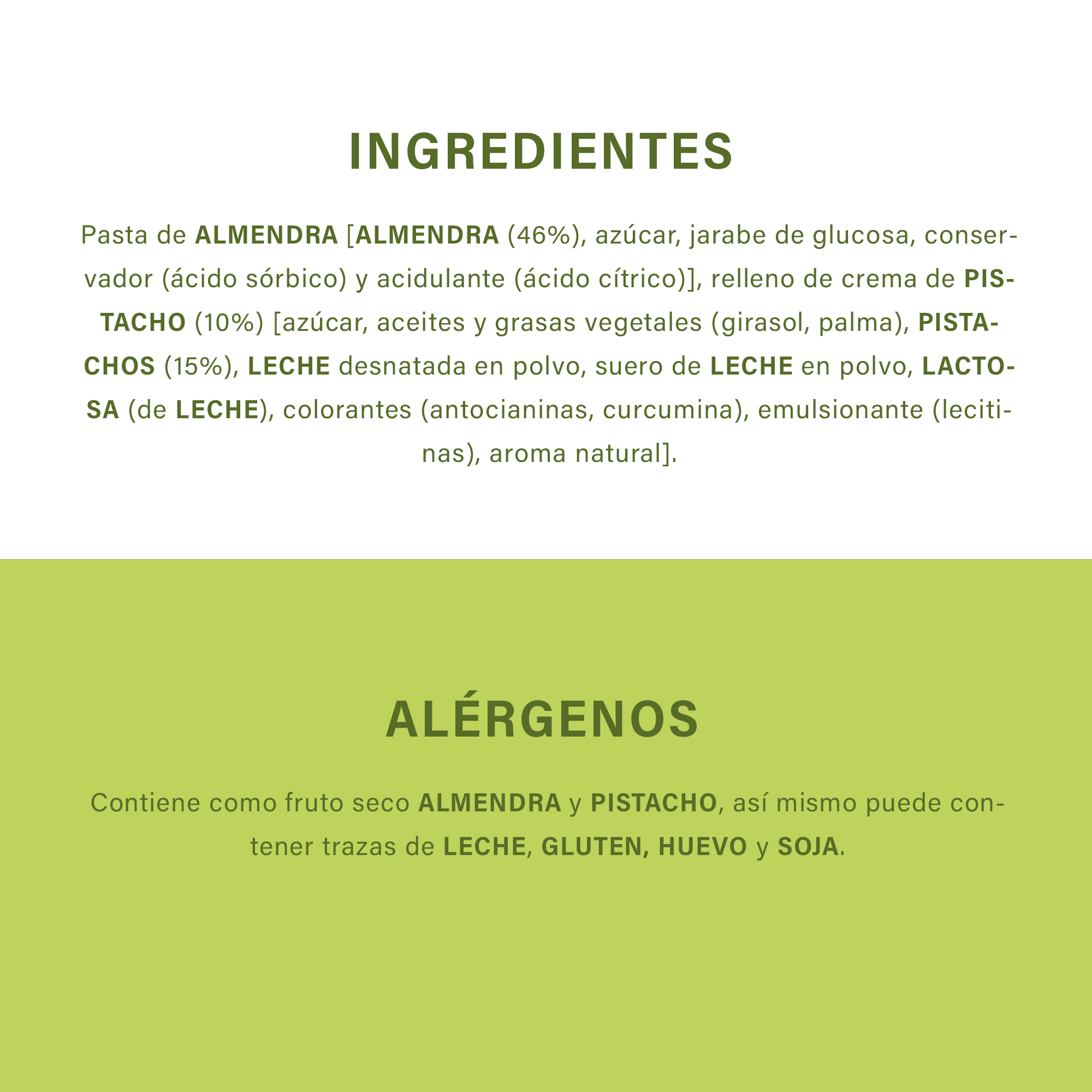 Almendra (46%), azúcar, jarabe de glucosa, relleno de crema de pistacho (10%) [azúcar, aceites y grasas vegetales (girasol, palma), pistachos (15%), leche desnatada en polvo, suero de leche en polvo, lactosa (de leche), colorantes (antocianinas, curcumina), emulsionante: lecitinas, aroma natural].