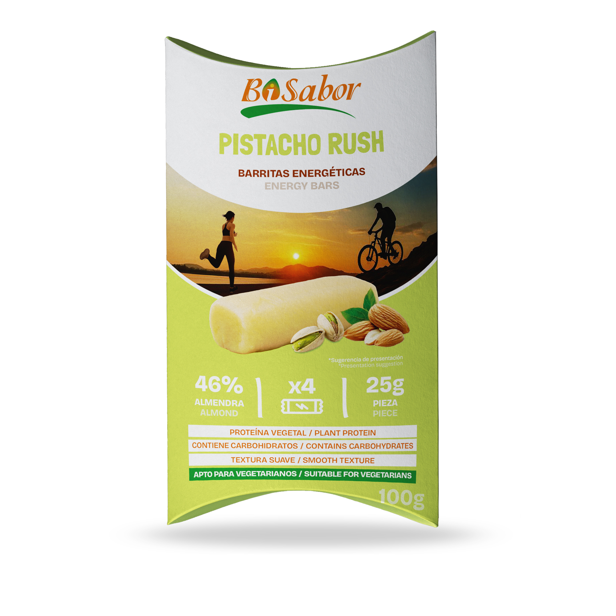 - COMBINACIÓN DE ALMENDRA Y CREMA DE PISTACHO PARA UNA ENERGÍA DELICIOSA Estas barritas energéticas están elaboradas con un 46% de almendra nacional y un relleno cremoso de pistacho. Una fusión suave y equilibrada, ideal para quienes buscan una alternativa de sabor intenso y textura blanda como snack diario.